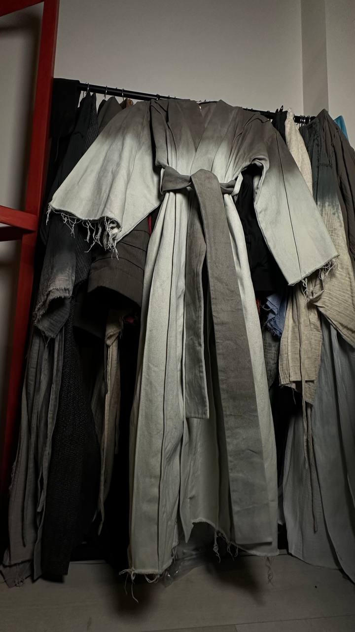 Кардиган-кімоно з щільного джинсу екрю, пофарбованого вручну. Верх має вишуканий відтінок матового коричневого з легким димчастим акцентом, який плавно переходить у світліший тон унизу. Такий природний градієнт нагадує відтінки каменю та землі. Складні технічні шви формують автентичний японський силует, а жорсткий широкий пояс підкреслює талію, створюючи гармонійний і розкішний образ. Це справжній діамант колекції - ексклюзивна річ, яку ви не знайдете більше ніде