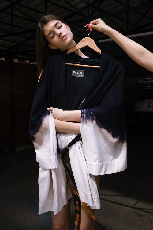 Легка юката з натуральної тканини, повністю окрашена вручну. Плавний перехід від чорного до молочного з димчастими відтінками сірого та коричневого робить її унікальною. Це нью-хау в Україні! Жоден виріб не повториться, адже все створено вручну. Ідеальний вибір для відпочинку та стильних вечірок. Подорожуйте зі своїм неповторним образом уже готовим!