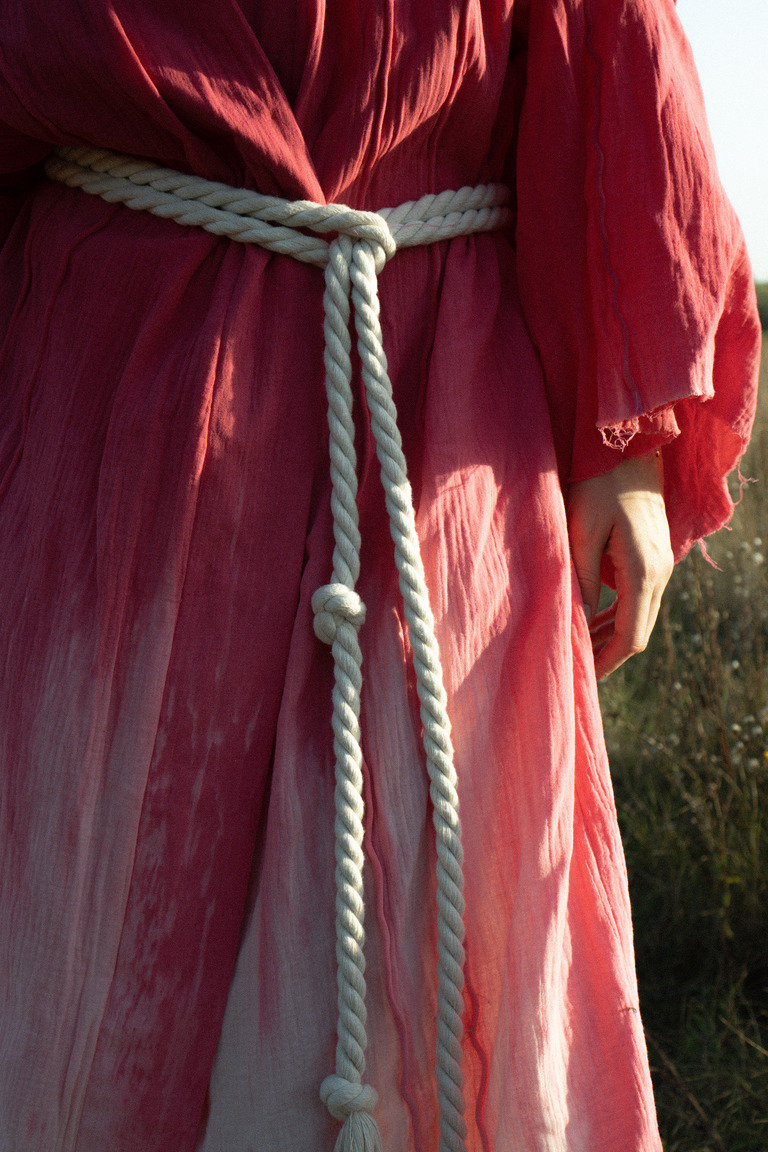 Це кімоно створене з натуральної тканини, яку ми власноруч пофарбували у плавний градієнт природних відтінків. Його особливість — у складному оздобленні: ми заморочилися над великою кількістю швів, які виконані завдяки техніці обшивання та вставлення канатних елементів. Такі «канатні» лінії надають виробу характеру й водночас допомагають кимоно тримати форму. Річ має зручні кишені, тож вона практична у щоденному використанні. Кимоно легко стилізувати під будь-який образ: носити у місті, брати з собою в подорож чи одягати на особливі події. Це універсальний елемент гардеробу, що поєднує майстерність, автентичність та сучасність.