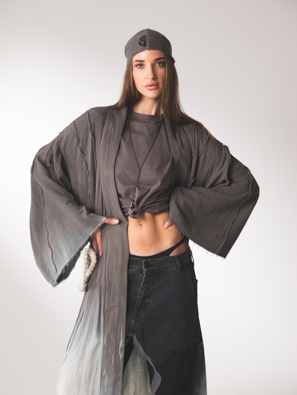 Це кимоно створене з натуральної тканини, яку ми власноруч пофарбували у плавний градієнт природних відтінків. Його особливість — у складному оздобленні: ми заморочилися над великою кількістю швів, які виконані завдяки техніці обшивання та вставлення канатних елементів. Такі «канатні» лінії надають виробу характеру й водночас допомагають кимоно тримати форму. Річ має зручні кишені, тож вона практична у щоденному використанні. Кимоно легко стилізувати під будь-який образ: носити у місті, брати з собою в подорож чи одягати на особливі події. Це універсальний елемент гардеробу, що поєднує майстерність, автентичність та сучасність.